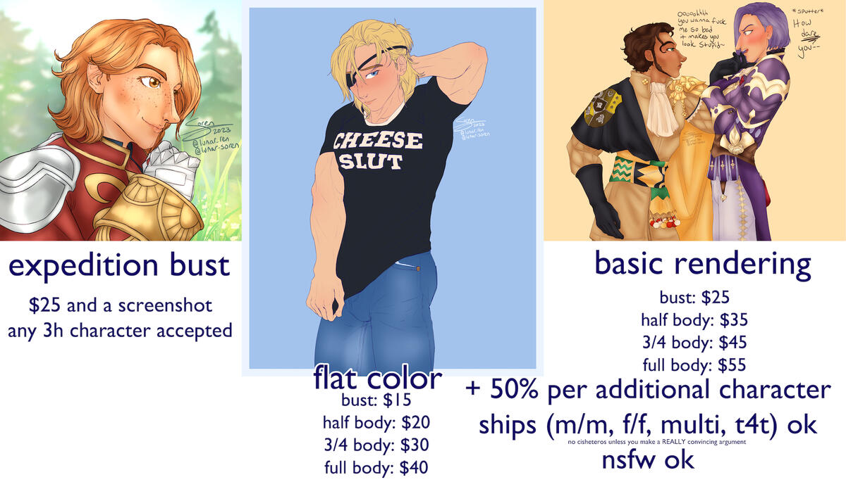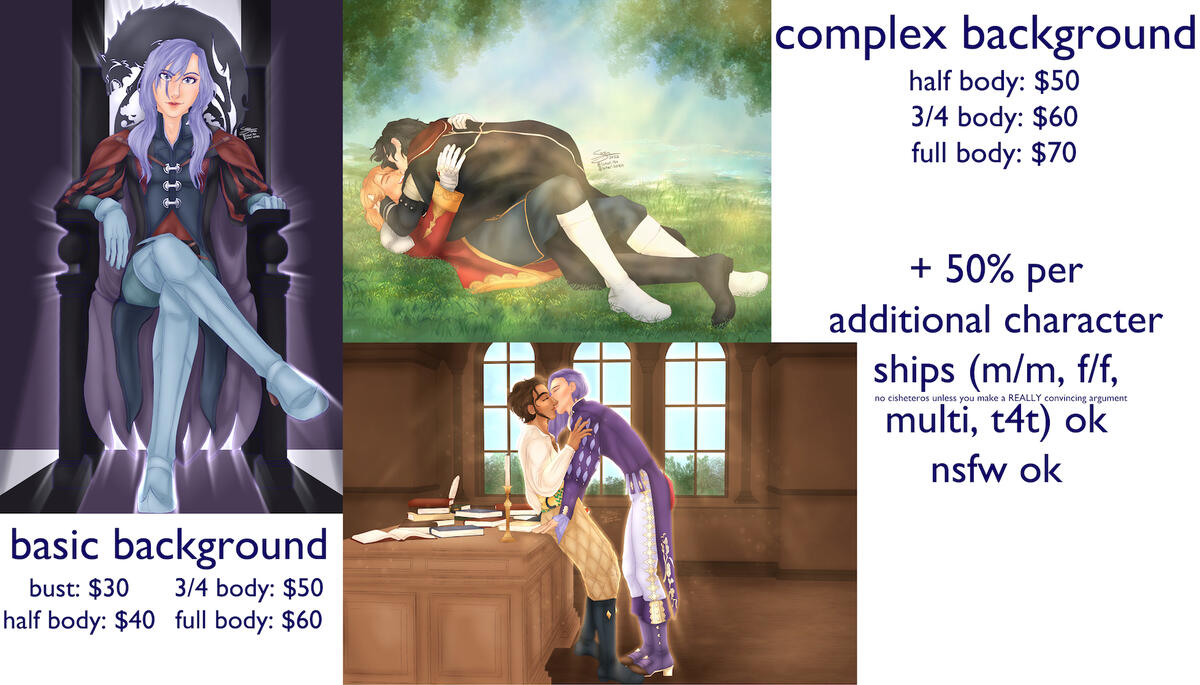 - commissions can either be paid 100% upfront, or 50% upfront as a deposit and 50% after the halfway-point check-in; payment must be made in full before I complete the commission